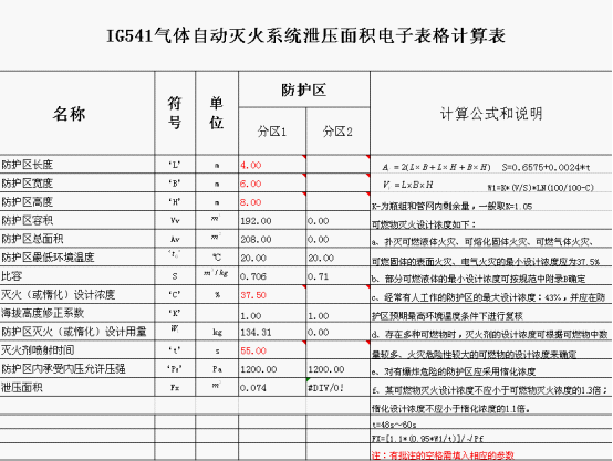 注:(1)IG541混合氣體滅火系統(tǒng)防護區(qū)泄壓口總泄壓面積計算和電子表格編制方法與七氟丙烷滅火系統(tǒng)相同,這里不再贅述。
