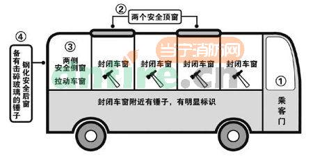 乘客只要旋轉(zhuǎn)車頂天窗上的紅色扳手,就能將天窗打開,從而迅速逃生。同時(shí),大部分空調(diào)客車都在車廂后部設(shè)置了逃生門和逃生氣窗,坐在車廂后部的乘客可就近迅速打開著兩個(gè)通道逃生。