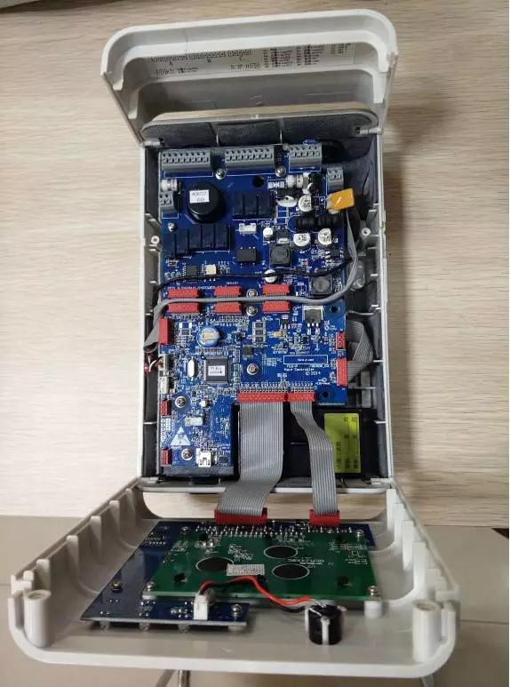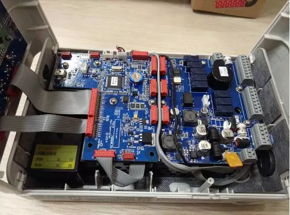 打開(kāi)探測(cè)器,可以看到探測(cè)器的顯示屏通過(guò)排線與主板連接。主板與繼電器輸出板也采用扁平排線連接。