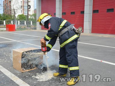 待紙箱內(nèi)的報(bào)紙進(jìn)入充分燃燒狀態(tài)后,消防隊(duì)員打開可樂瓶蓋,用手按住瓶口搖晃可樂瓶,將其對(duì)準(zhǔn)紙箱內(nèi)的火焰,只見瓶中的可樂很快以水柱狀噴向紙箱,短短3秒鐘,火焰就被完全噴熄,紙箱中騰出一片煙霧后,消防隊(duì)員確認(rèn)火被完全撲滅,沒有復(fù)燃可能。