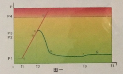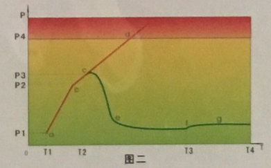 當(dāng)變壓器出現(xiàn)內(nèi)部故障,產(chǎn)生高溫或電弧,變壓器油或內(nèi)部材料可以分解出瓦斯氣體,變壓器內(nèi)部的壓力和溫度增加。如變壓器壓力釋放閥拒動(dòng),變壓器內(nèi)部壓力將迅速超過(guò)變壓器油箱的安全壓力P4,可能造成殼體爆裂并引發(fā)火災(zāi),見(jiàn)圖一,a-b-c-d圖線為壓力變化曲線;如變壓器壓力釋放閥不能有效動(dòng)作,變壓器內(nèi)部壓力仍可能超過(guò)變壓器安全壓力P4,造成殼體爆裂并引發(fā)火災(zāi),見(jiàn)圖二壓力變化曲線。