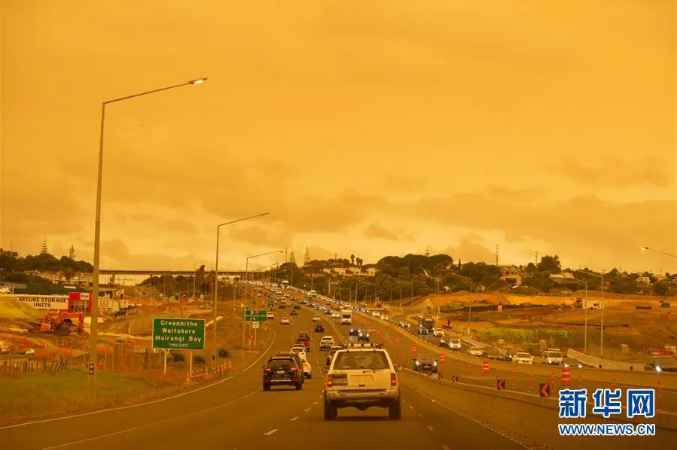 澳大利亞東南海岸森林大火產(chǎn)生的煙塵飄過塔斯曼海,抵達(dá)新西蘭北島北部地區(qū)上空,新西蘭最大城市奧克蘭籠罩在黃褐色煙塵中。