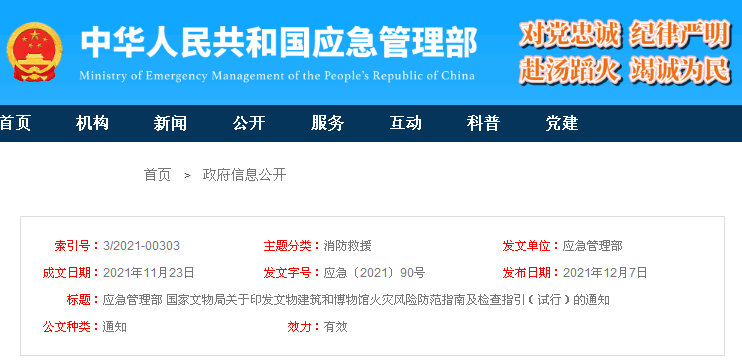 為深入貫徹習近平總書記關于安全生產(chǎn)重要論述,全面加強文物建筑和博物館火災防范工作,應急管理部、國家文物局研究制定了《文物建筑火災風險防范指南(試行)》《文物建筑火災風險檢查指引(試行)》和《博物館火災風險防范指南(試行)》《博物館火災風險檢查指引(試行)》。現(xiàn)印發(fā)給你們,請結合實際認真貫徹落實,廣泛開展宣傳培訓,督促指導文物建筑和博物館管理使用單位遵照執(zhí)行。