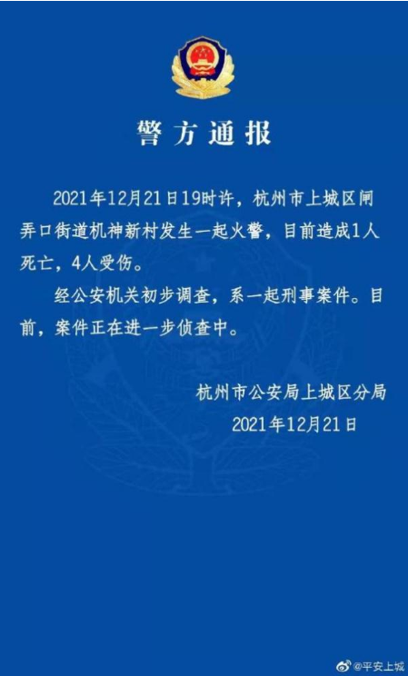 杭州市公安局上城分局官方微博12月21日通報(bào),今晚發(fā)生一起火警,目前造成1死4傷。經(jīng)初步調(diào)查,系一起刑事案件。目前,案件正在進(jìn)一步偵查中。