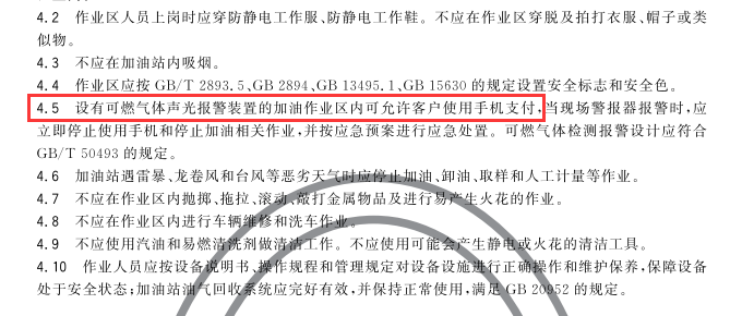 根據(jù)應(yīng)急管理部意見,考慮到加油站特殊場所,為加強油氣安全風險管控,如果掃碼處位于加油作業(yè)區(qū),應(yīng)設(shè)置可燃氣體聲光報警裝置。出現(xiàn)報警時,應(yīng)立即停止使用移動通訊設(shè)備和停止加油相關(guān)作業(yè),按預(yù)案采取應(yīng)急處置行動。同時考慮手機起火爆炸多發(fā)生在充電過程,故規(guī)定手機在充電狀態(tài)下嚴禁用于掃碼支付。