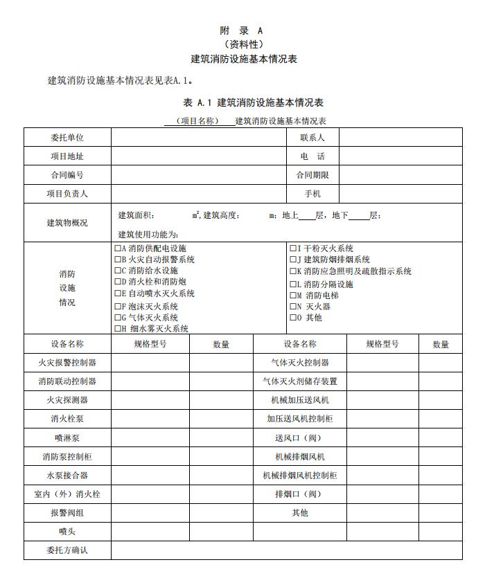 5.2.1 消防設施技術服務機構應收集維護保養(yǎng)項目的總平面布局圖、平面圖、系統(tǒng)圖、產品使用說明書等技術資料,現(xiàn)場確認建筑消防設施的系統(tǒng)種類并統(tǒng)計建筑消防設施各系統(tǒng)主要設備的規(guī)格型號和數(shù)量,填寫《建筑消防設施基本情況表》,見附錄A。