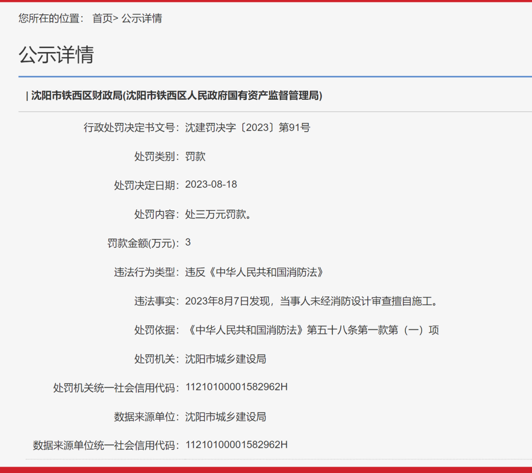 信用中國網(wǎng)站消息:近日,沈陽市城鄉(xiāng)建設(shè)局對沈陽市鐵西區(qū)財政局(沈陽市鐵西區(qū)人民政府國有資產(chǎn)監(jiān)督管理局)作出處罰決定。違法事實:2023年8月7日發(fā)現(xiàn),當(dāng)事人未經(jīng)消防設(shè)計審查擅自施工。處罰依據(jù):《中華人民共和國消防法》第五十八條第一款第(一)項。處罰類別:罰款處罰。處罰內(nèi)容:處三萬元罰款。
