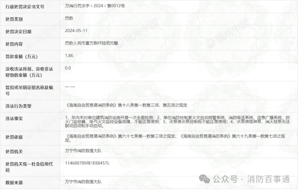 處罰機(jī)關(guān):萬寧市消防救援大隊(duì)