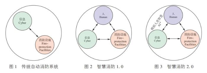 清華大學(xué)研究員杜明芳提出了智慧建筑的CPS理論模型,智慧消防是智慧建筑的一個(gè)有機(jī)的組成部分。所以,借鑒其理論模型,從智慧建筑的視角推演出智慧消防的理論模型:系統(tǒng)構(gòu)成涉及了人、信息和消防設(shè)施三個(gè)要素,協(xié)同關(guān)聯(lián)綜合構(gòu)成了智慧消防系統(tǒng)。該模型中,傳統(tǒng)的自動(dòng)消防系統(tǒng)表現(xiàn)為基于信息-消防設(shè)施的二元系統(tǒng),見(jiàn)圖1,其信息空間以現(xiàn)場(chǎng)總線、智能控制為主。智慧消防系統(tǒng)則用基于人-信息-消防設(shè)施的三元系統(tǒng)來(lái)表示,智慧消防分為兩個(gè)發(fā)展階段,可以稱(chēng)為“智慧消防1.0”和“智慧消防2.0”。“智慧消防1.0”見(jiàn)圖2,其在信息系統(tǒng)這一維度上更多地依賴(lài)于物聯(lián)網(wǎng)、云計(jì)算、大數(shù)據(jù)、智能控制技術(shù),信息互通與集成優(yōu)化是這個(gè)階段構(gòu)建系統(tǒng)的重要內(nèi)容,目前正處于這個(gè)發(fā)展階段,并已日漸成熟。“智慧消防2.0”見(jiàn)圖3,則更多地依賴(lài)于人工智能(Artificial Intelligence,AI)技術(shù),引入了AI后將更多地體現(xiàn)出人-機(jī)共融特征,系統(tǒng)將具備自主學(xué)習(xí)、智能決策、自組織系統(tǒng)、自尋優(yōu)進(jìn)化等能力,將是以后的發(fā)展方向。