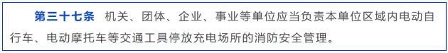 隨著新能源產(chǎn)業(yè)的發(fā)展,為人民的交通出行帶來更多選擇,但同樣產(chǎn)生了諸多消防安全隱患,例如因電動汽車等交通工具的不合規(guī)充電問題引發(fā)的火災(zāi)等?!端拇ㄊ∠罈l例》修訂稿第三十七條規(guī)定,要求各單位對區(qū)域內(nèi)電動交通工具停放充電場所的消防安全管理。