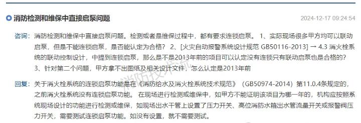 關(guān)于消火栓系統(tǒng)的連鎖啟泵功能是在《消防給水及消火栓系統(tǒng)技術(shù)規(guī)范》(GB50974-2014)第11.0.4條規(guī)定的,之前消火栓系統(tǒng)沒有連鎖啟泵功能。在現(xiàn)場進(jìn)行檢測或維保中,如甲方不能證明該項目為哪一年的,機(jī)構(gòu)應(yīng)按照系統(tǒng)現(xiàn)場設(shè)計的功能進(jìn)行檢測或維保,如現(xiàn)場出水干管上設(shè)置了壓力開關(guān)、高位消防水箱出水管流量開關(guān)或報警閥壓力開關(guān),需要測試連鎖啟泵功能。如沒有設(shè)置,就不需要測試。