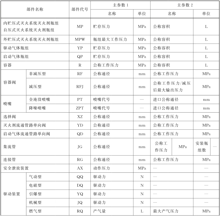 滅火系統(tǒng)中部件的型號由滅火系統(tǒng)類別代號(見4.1)、部件代號(見表A.1)、主參數(shù)(見表A.1)、生產(chǎn)者自定義四部分組成。主參數(shù)分主參數(shù)1和主參數(shù)2。