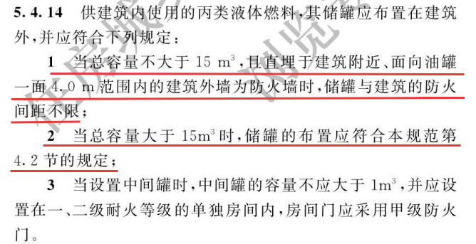 民用建筑(工業(yè)建筑亦可參考)若所需油量大于5m³時,但不大于15m³的,可按《建規(guī)》5.4.14條規(guī)定設(shè)置室外的埋地儲罐并設(shè)防火墻時,間距可不限;不滿足上述條件的或總油量超過15m³的,必須按《建規(guī)》4.2節(jié)考慮防火間距。比如大型商業(yè)綜合體,若室外柴油發(fā)電機(jī)組儲油量較大,超過5m³,就需嚴(yán)格按照規(guī)范確定防火間距。
