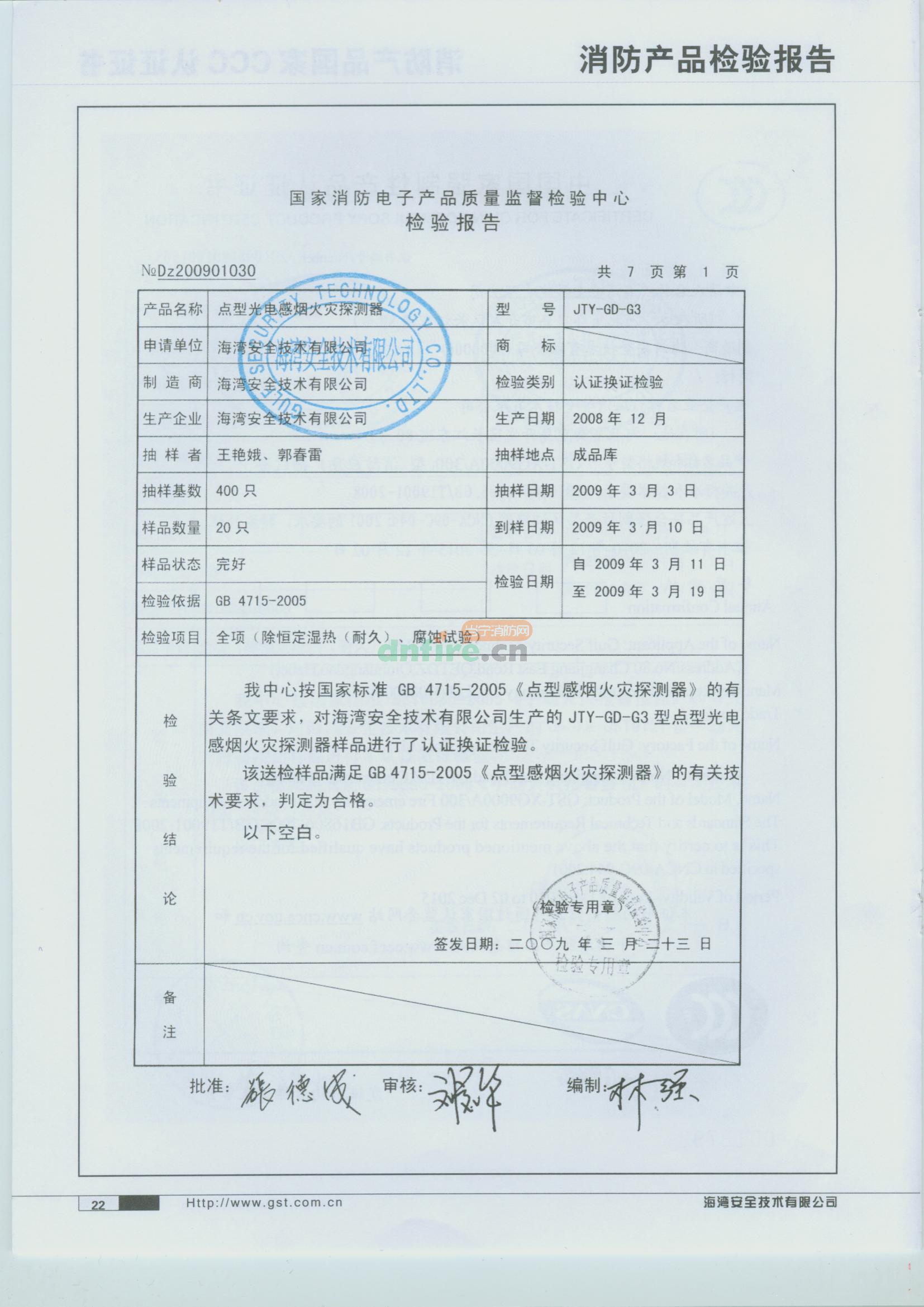 檢驗結(jié)論:我中心按國家標準GB 4715-2005《點型感煙火災(zāi)探測器》的有關(guān)條文要求,對海灣安全技術(shù)有限公司生產(chǎn)的JTY-GD-G3型點型光電感煙火災(zāi)探測器樣品進行了認證換證檢驗。