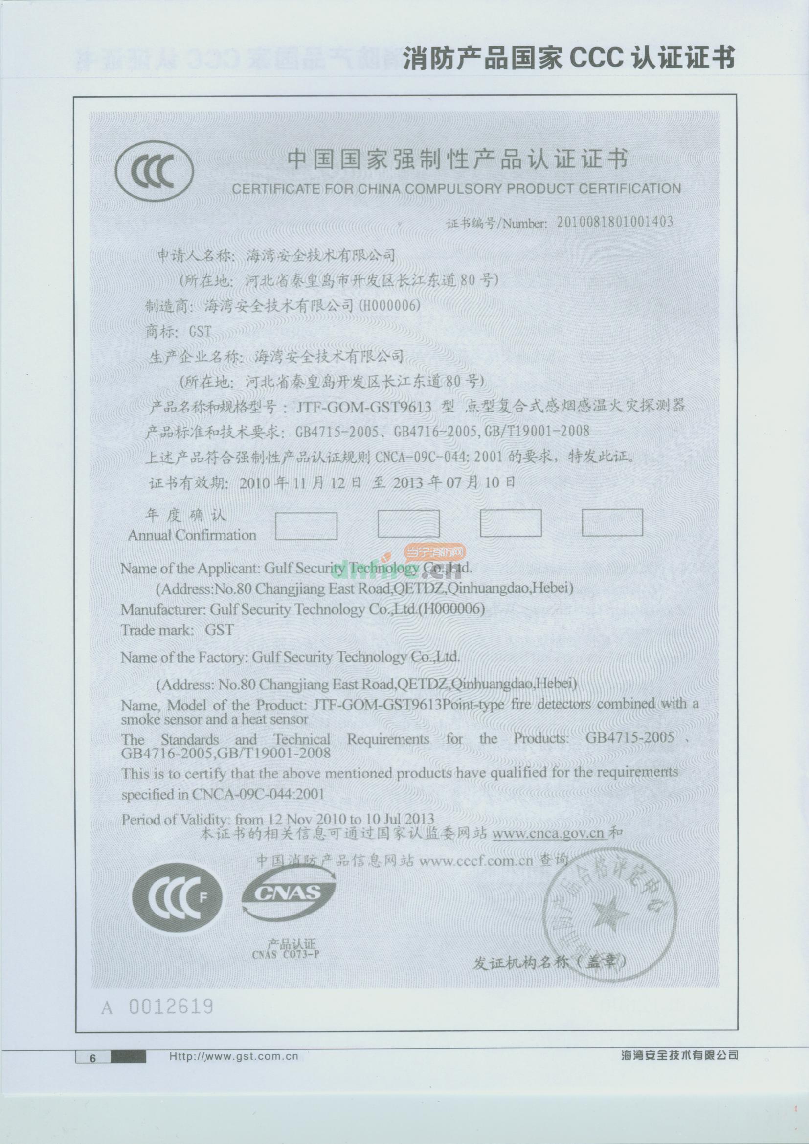 證書有效期:2010年11月12日至2013年07月10日
