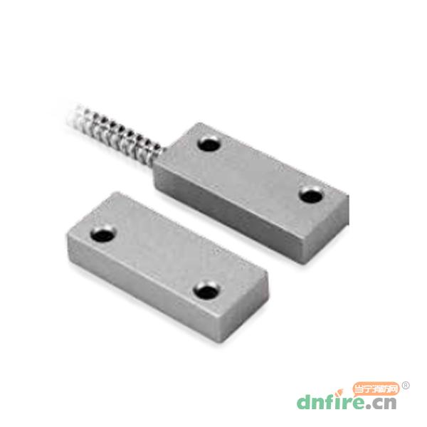 門磁開關(guān)主要由開關(guān)和磁鐵兩部門組成,開關(guān)部分由磁簧開關(guān)經(jīng)引線連接,定型封裝而成;磁鐵部分由對應(yīng)的磁場強度的磁鐵封裝于塑膠或合金殼體內(nèi)。當(dāng)兩者分開或接近至一定距離后,引起開關(guān)的開斷從而感應(yīng)物體門磁開關(guān)位置的變化,并將此狀態(tài)信號傳至防火門監(jiān)控模塊。