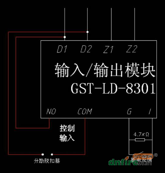 Z1、Z2:接火災(zāi)報(bào)警控制器信號(hào)二總線,無極性