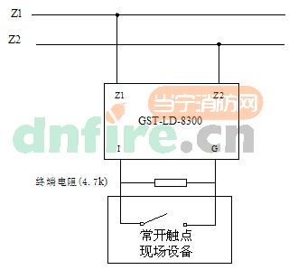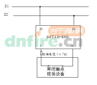 2、GST-LD-8300輸入模塊與具有常閉無(wú)源觸點(diǎn)的現(xiàn)場(chǎng)設(shè)備連接方法如圖所示,模塊輸入設(shè)定參數(shù)設(shè)為常閉檢線。