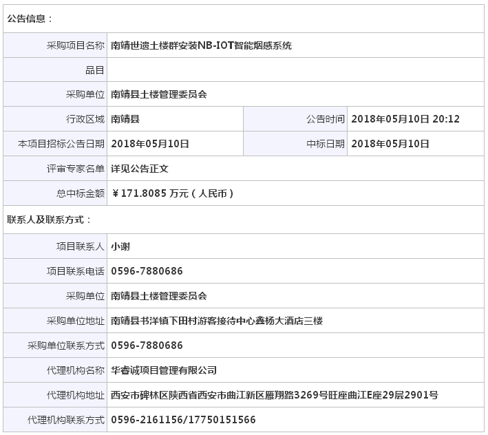 南靖世遺土樓群安裝NB-IOT智能煙感系統(tǒng)結果公告
